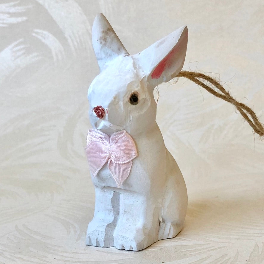 Welcome Spring with a hand carved white wooden bunny rabbit ornament with a pretty pink glittered nose, and a vintage pink satin bow tie.