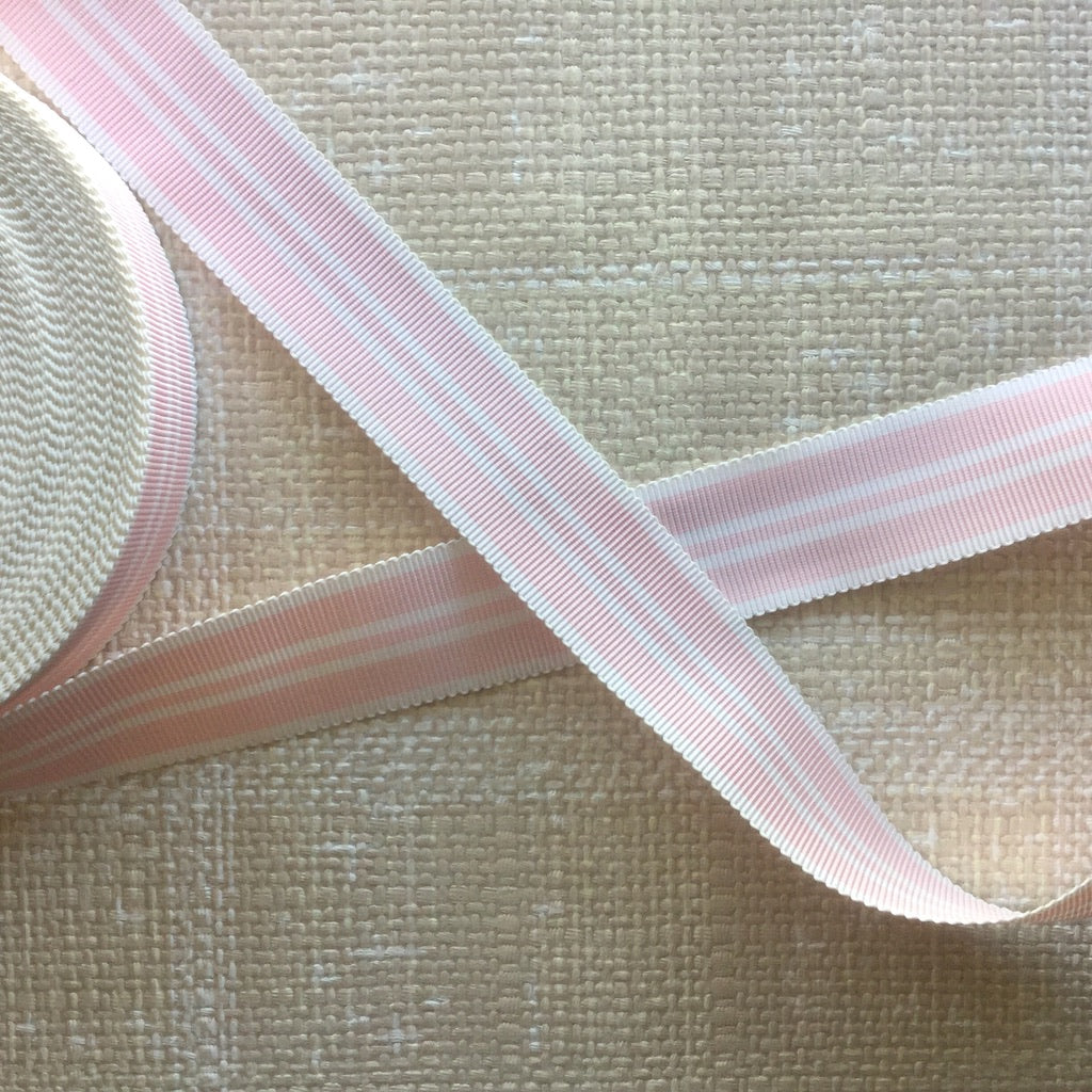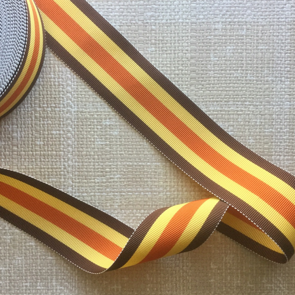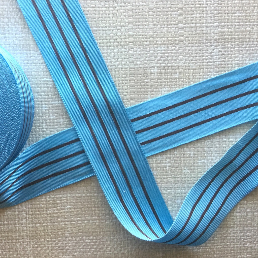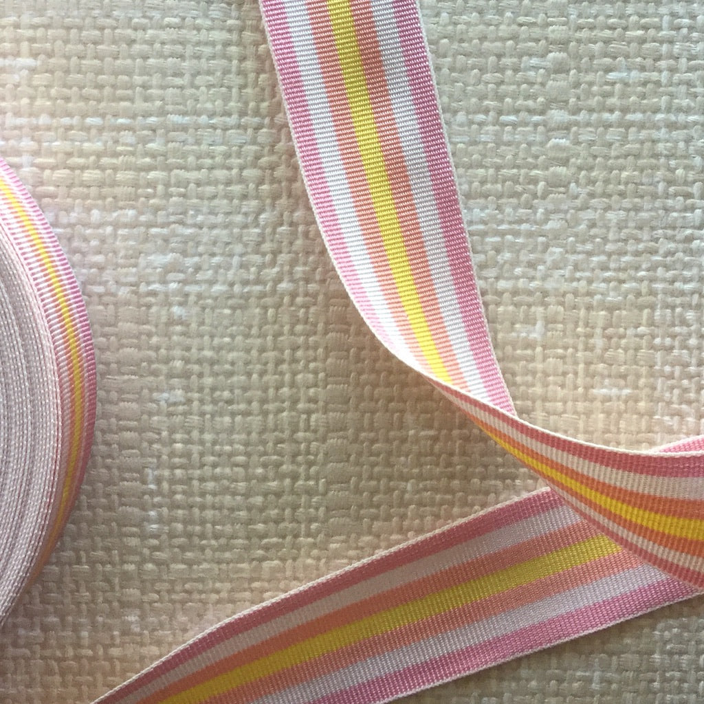 Sporty retro stripes woven into a grosgrain textured ribbon. Strong enough for straps, ties or just to add a fun yet tailored look to your creations. Polyester and acetate.