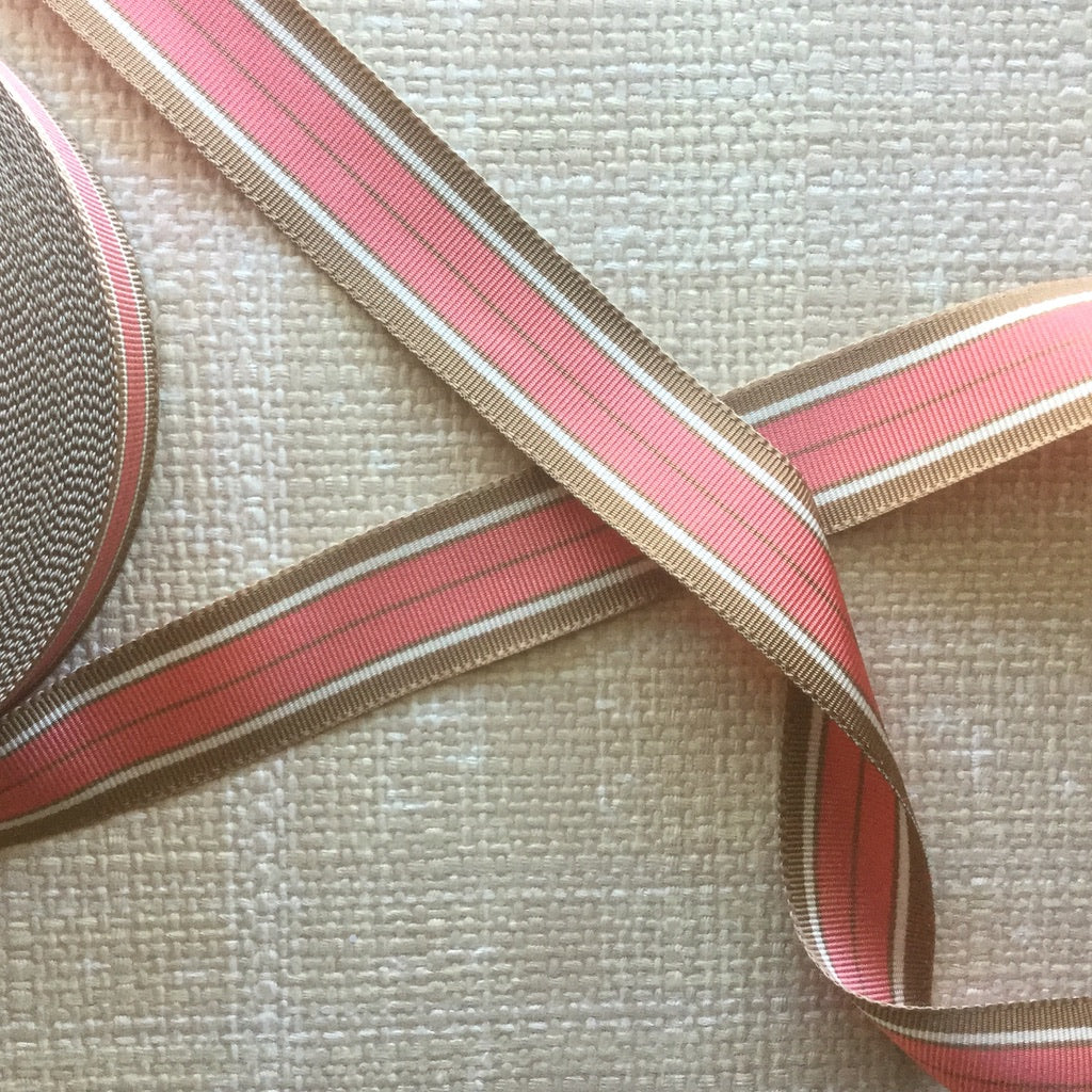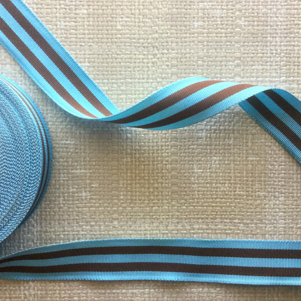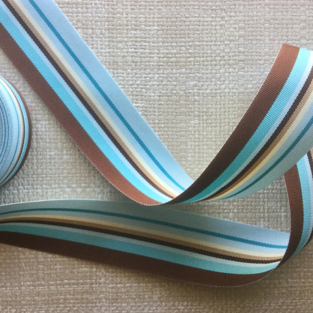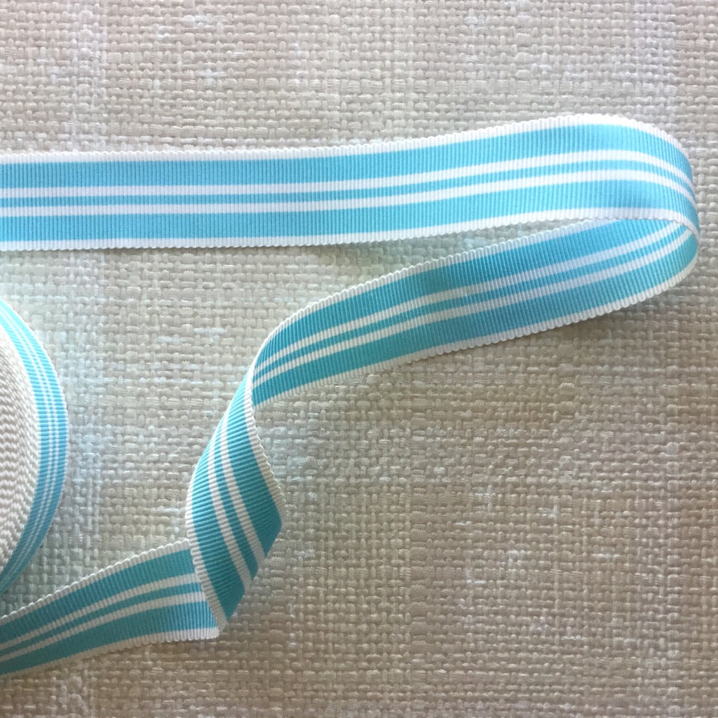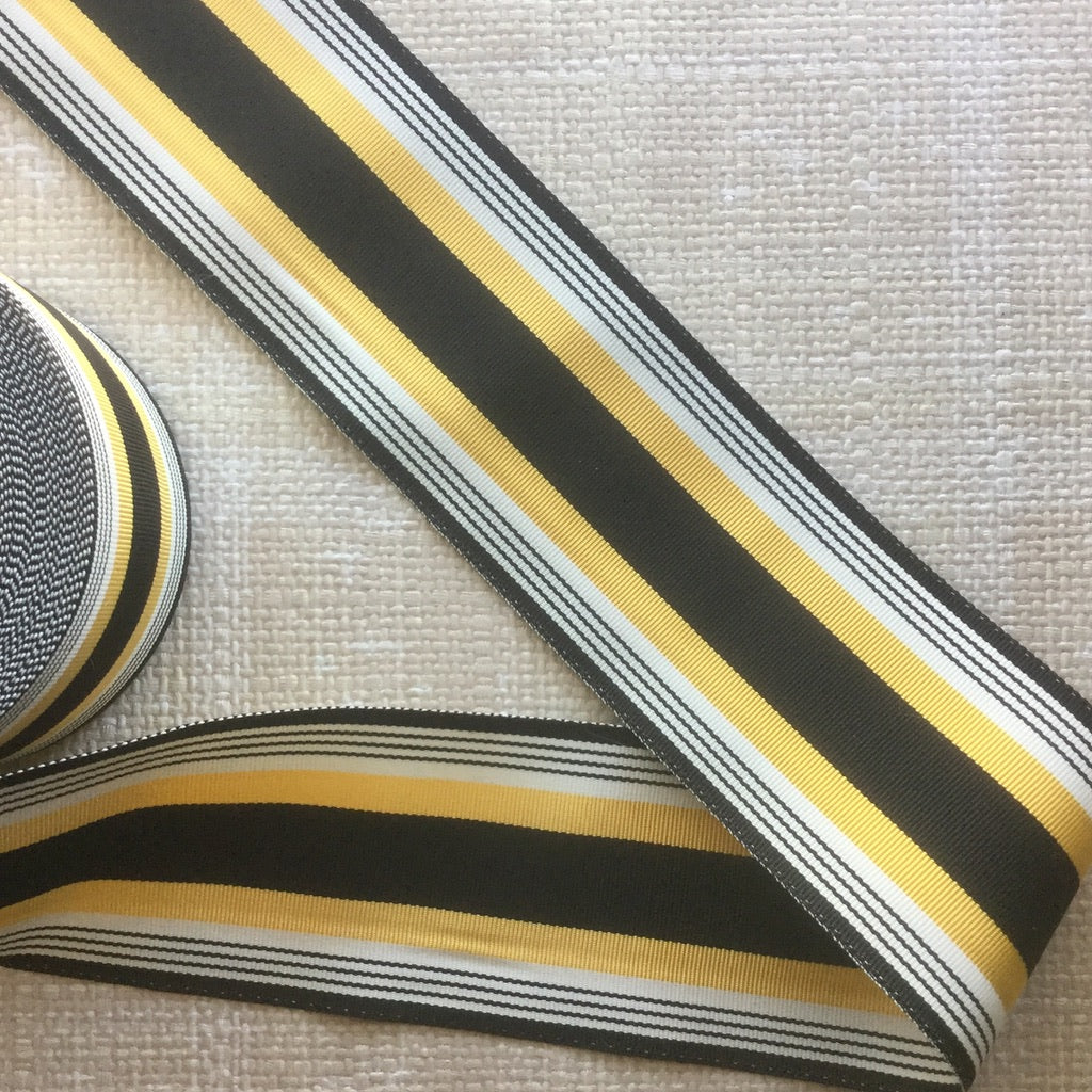 Sporty retro stripes woven into a grosgrain textured ribbon. Strong enough for straps, ties or just to add a fun yet tailored look to your creations. Polyester and acetate.