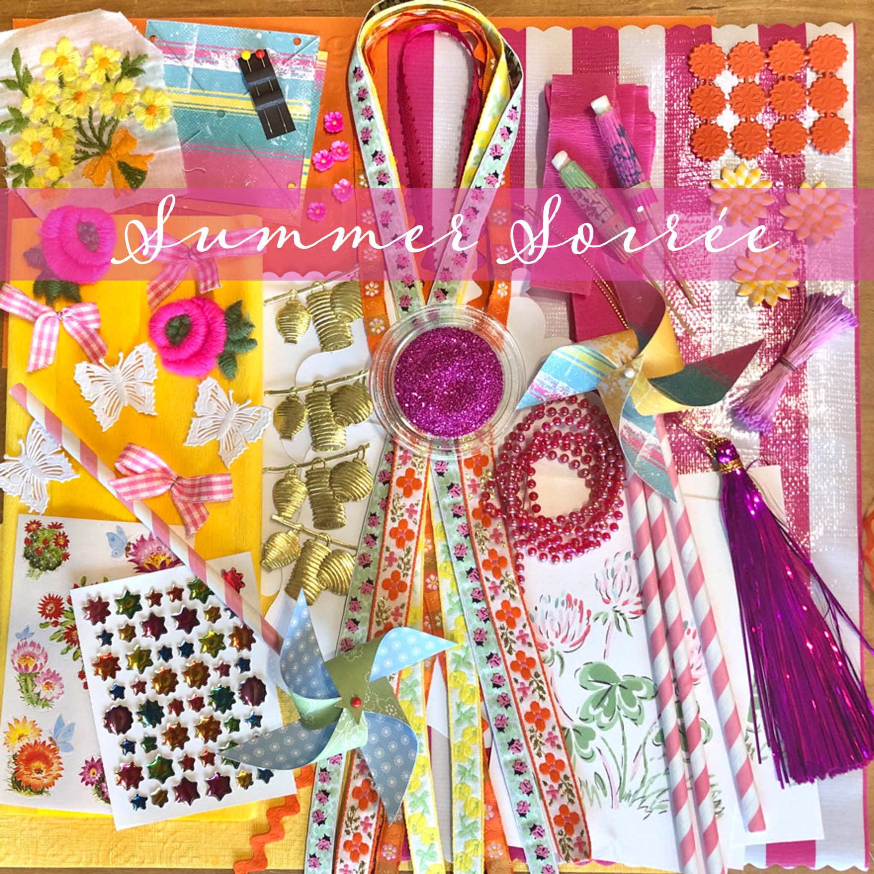 It all begins with a striped oilcloth matt, our pretty clover flat cards, bright fuchsia mylar tassel, some shiny sunny fruity stickers and succulent flowers stickers. Jacquards, satins, and pearls. Little vintage paper umbrellas for your favorite tropical beverage, fuchsia glass glitter, pink check bows, yellow check sunflowers, doublette crepe, Chinese lantern Dresden die cuts, as well as white butterflies and orange flowers. And you can make a pair of pinwheels with 2 of the enclosed pink stripe paper straws and pre-cut cardstock.