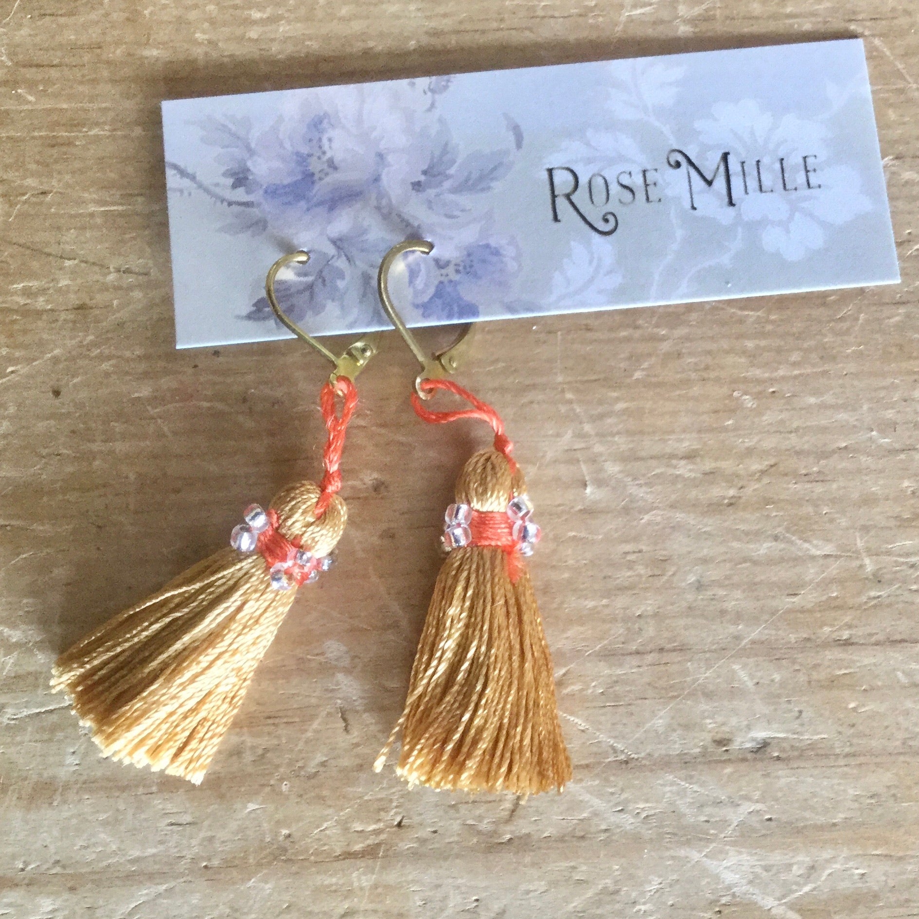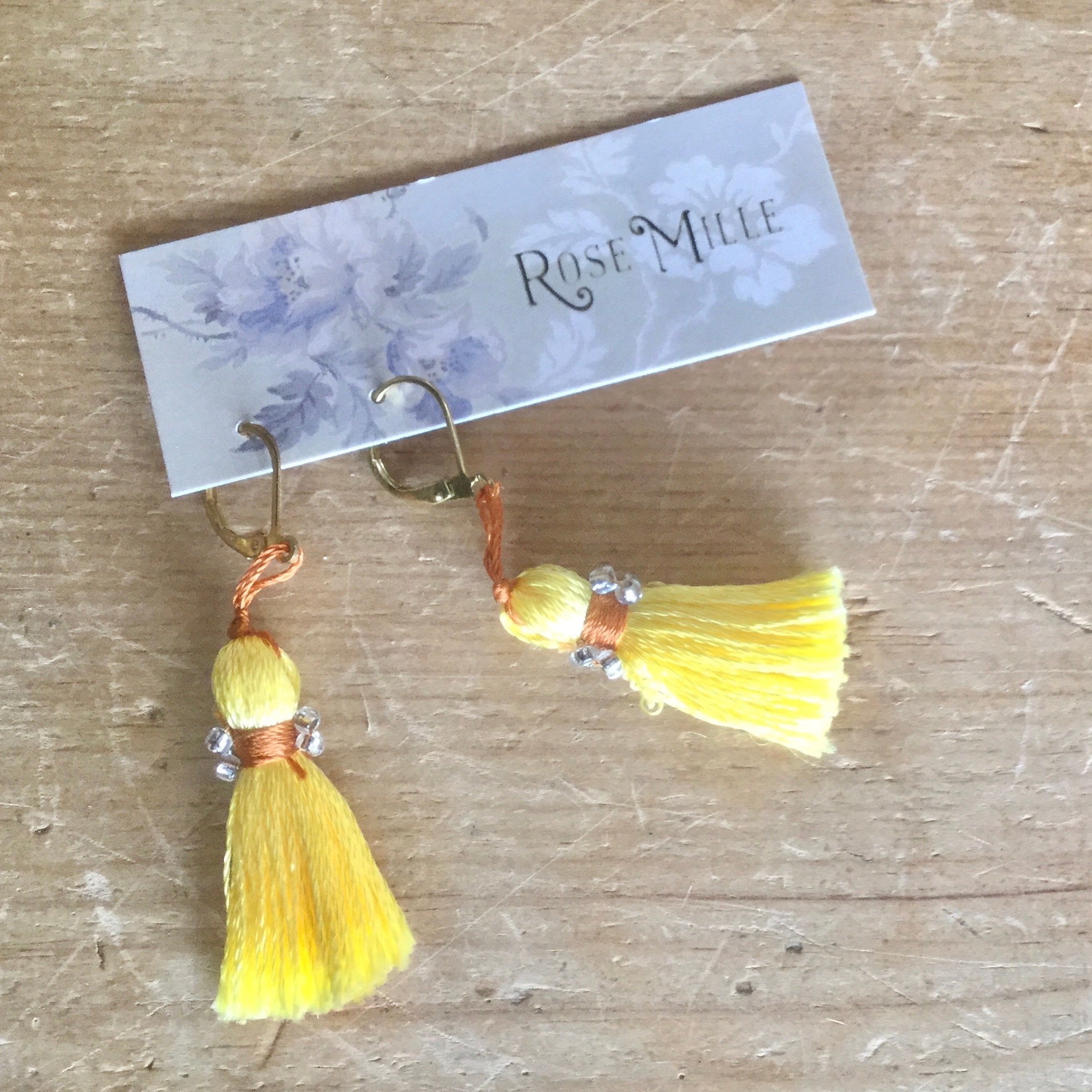 Modern hand tied tassel earrings with contrast trim and glass beads. Light, fun and tres chic!