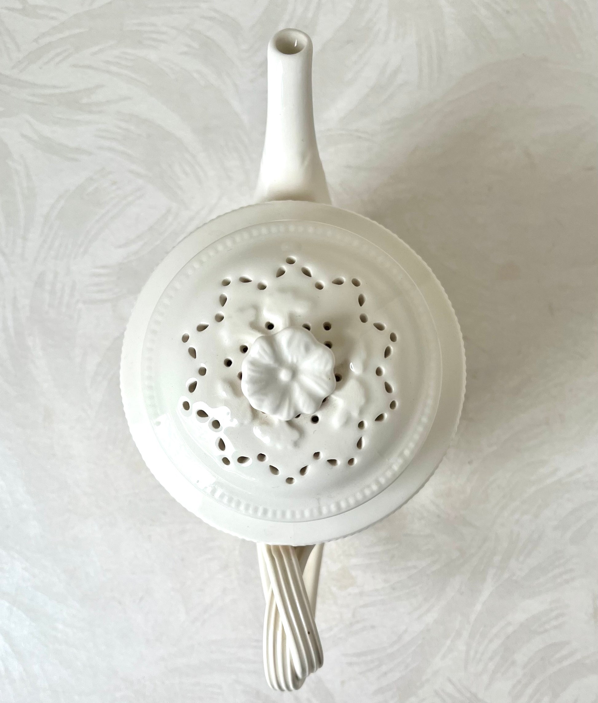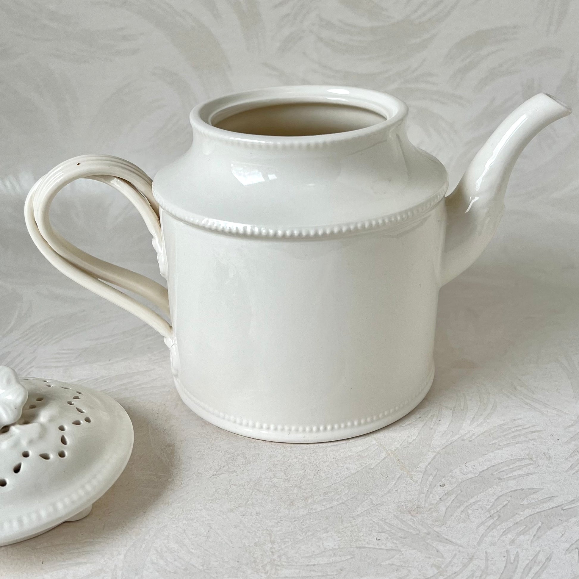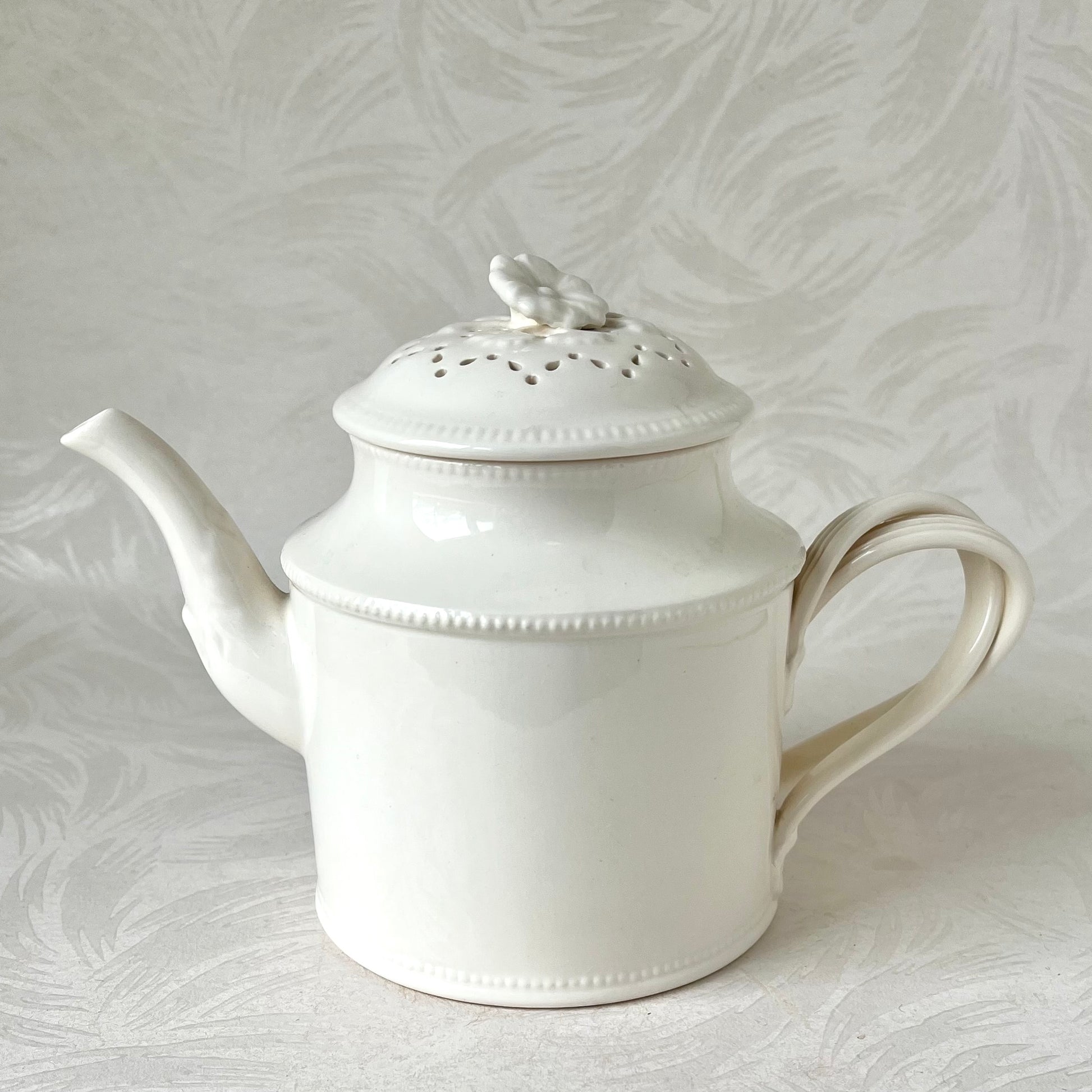 A beautiful example of the work of this Hartley Green & Co.teapot. Subtle in color, but the details are there. From the botanical relief design on the spout, dotted circumference, pierced work done by hand on the lid, and twisted double handle applied with a flower motif. Gorgeous