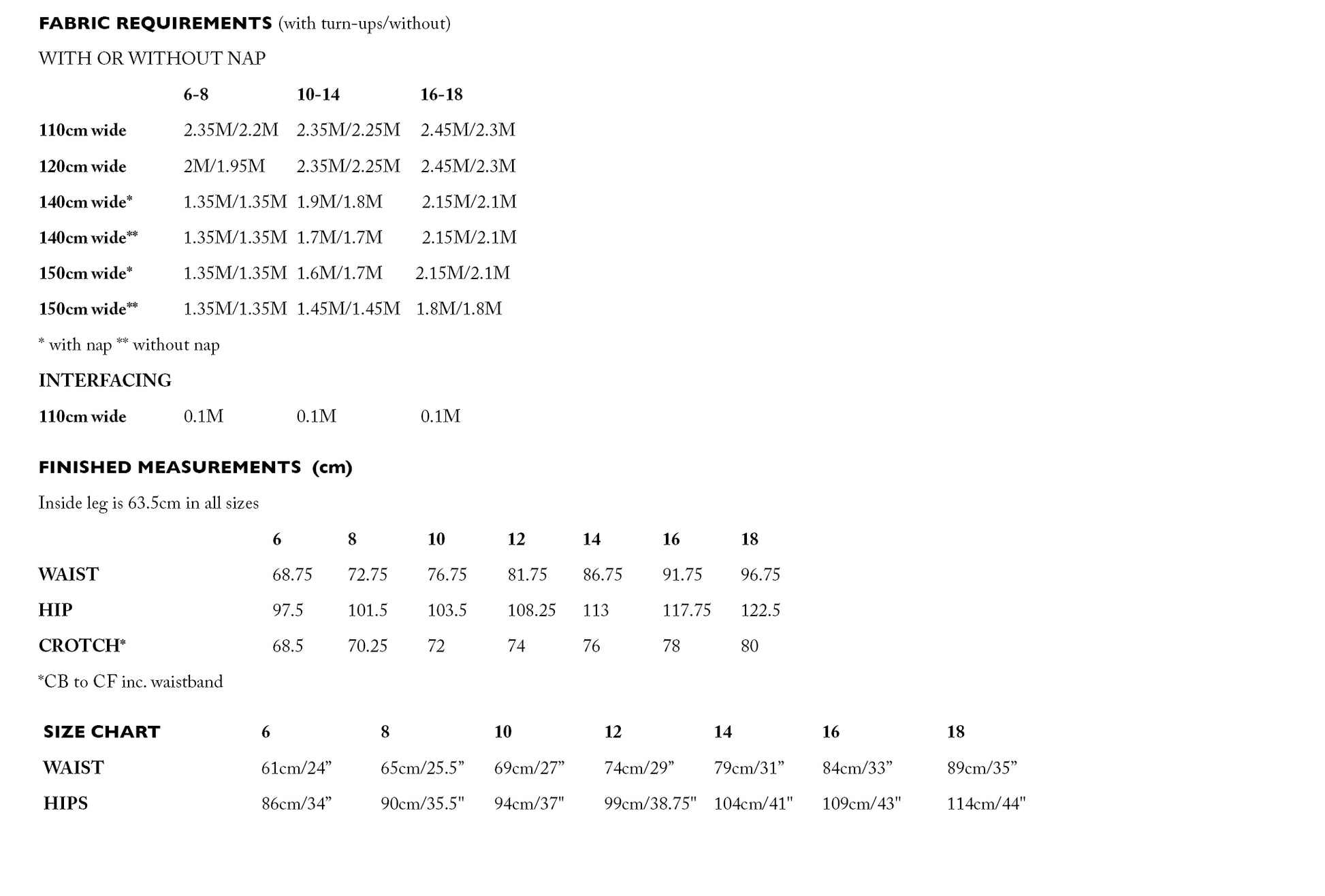 Fabric suggestions - The Eve Trousers are ideally suited to a mid-heavyweight cotton canvas, as this keeps the structured shape. Twills, corduroy, light-medium weight woollens and 7 - 12oz denim. You can use lighter weight cloths like linen and potentially a Tencel/linen but this will give you a softer silhouette.