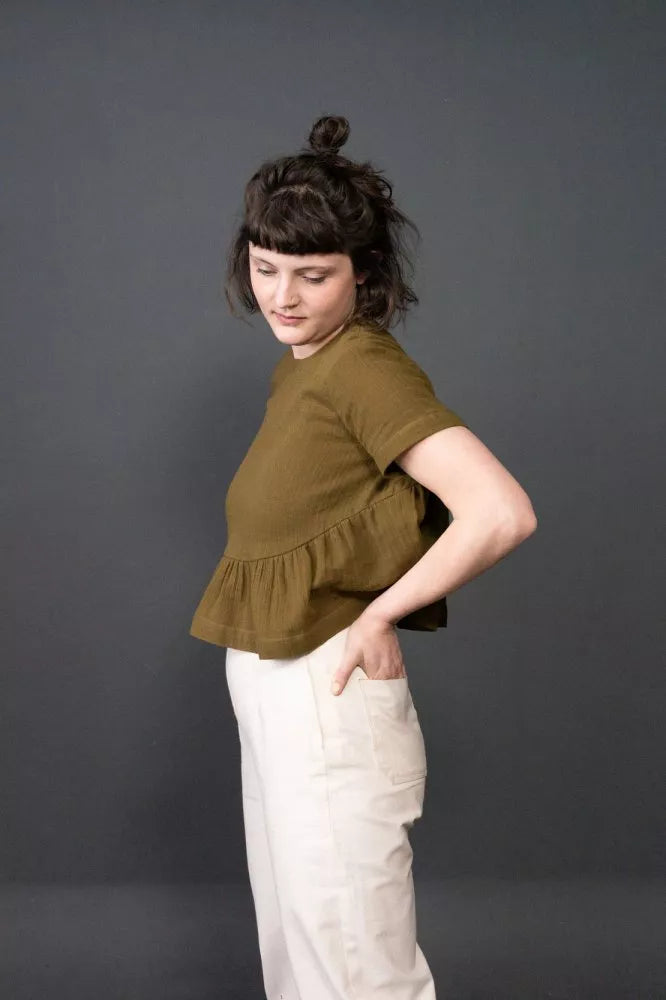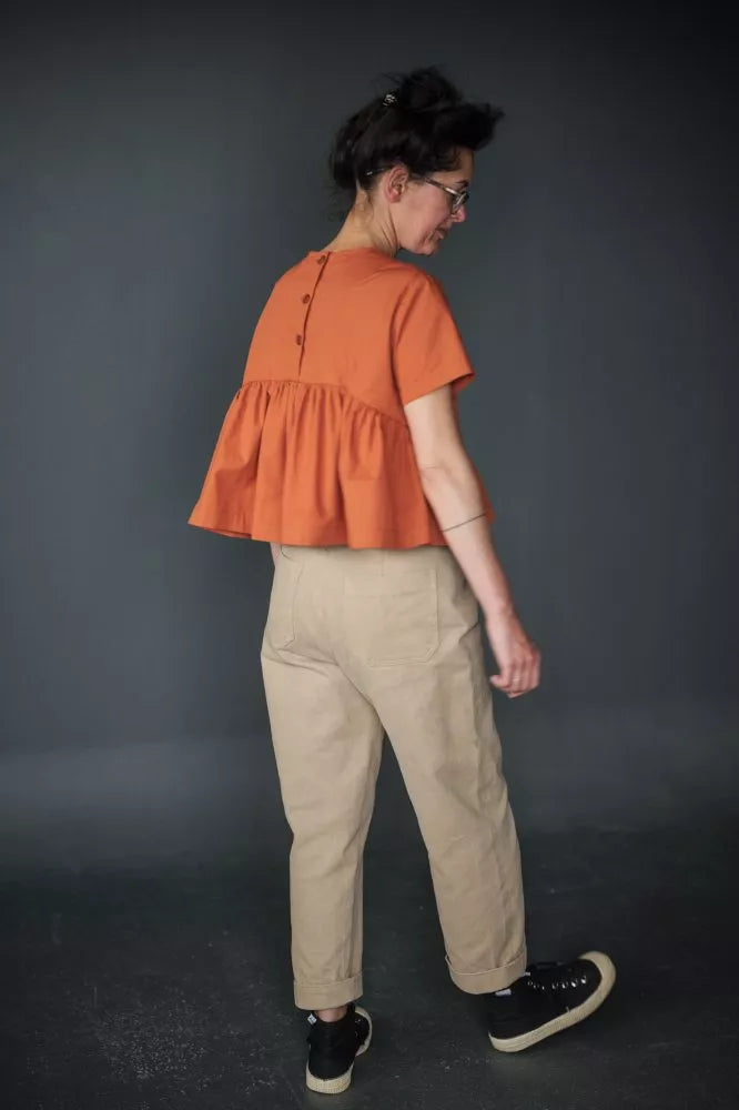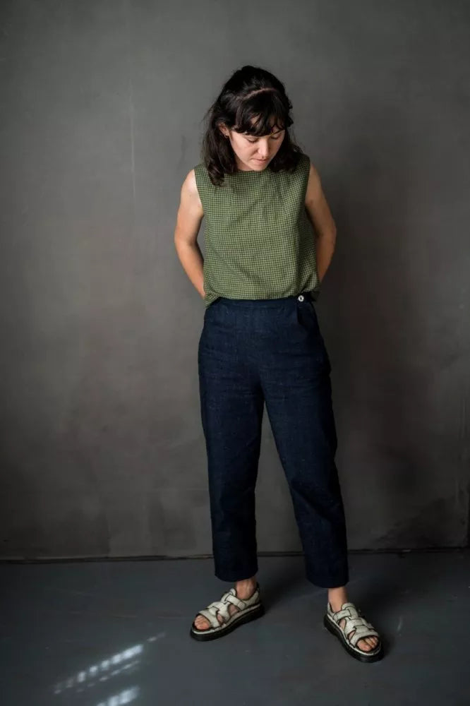 The Eve Trouser is cropped, with a slightly tapered leg and optional turn ups. It's an easy garment to make, fitting neatly at the waist and over the hips with a simple side zip and two back pockets. Choose to make pleats or darts into the waist seam.
