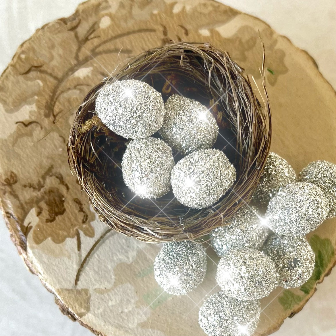 We couldn't resist covering our tiny spun cotton eggs with sterling glass glitter. Each little egg measures about ¾" x ½"