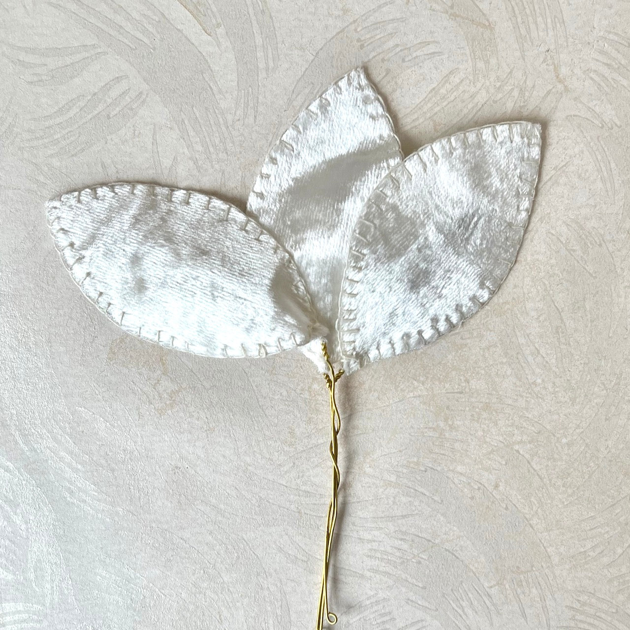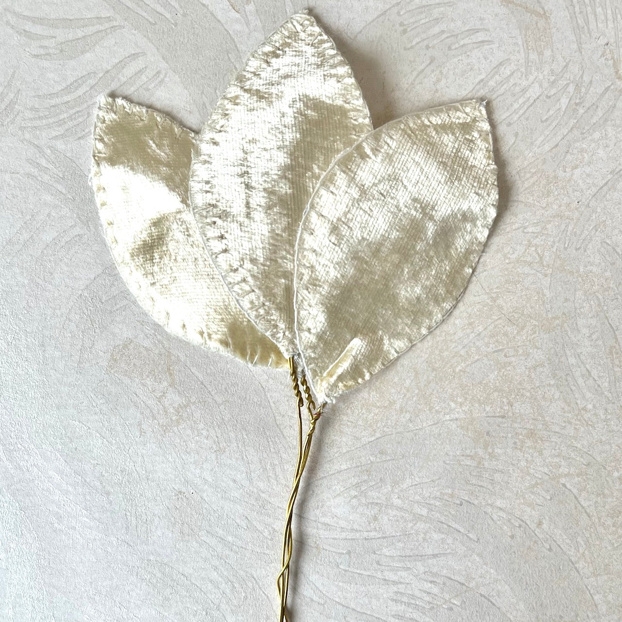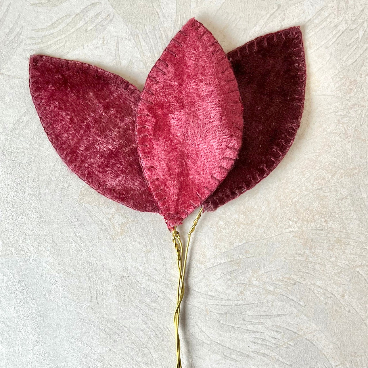 Three velvet leaves with hand stitched edges on gold wires. Perfect for wreaths, hats, lamp shades or even a package.