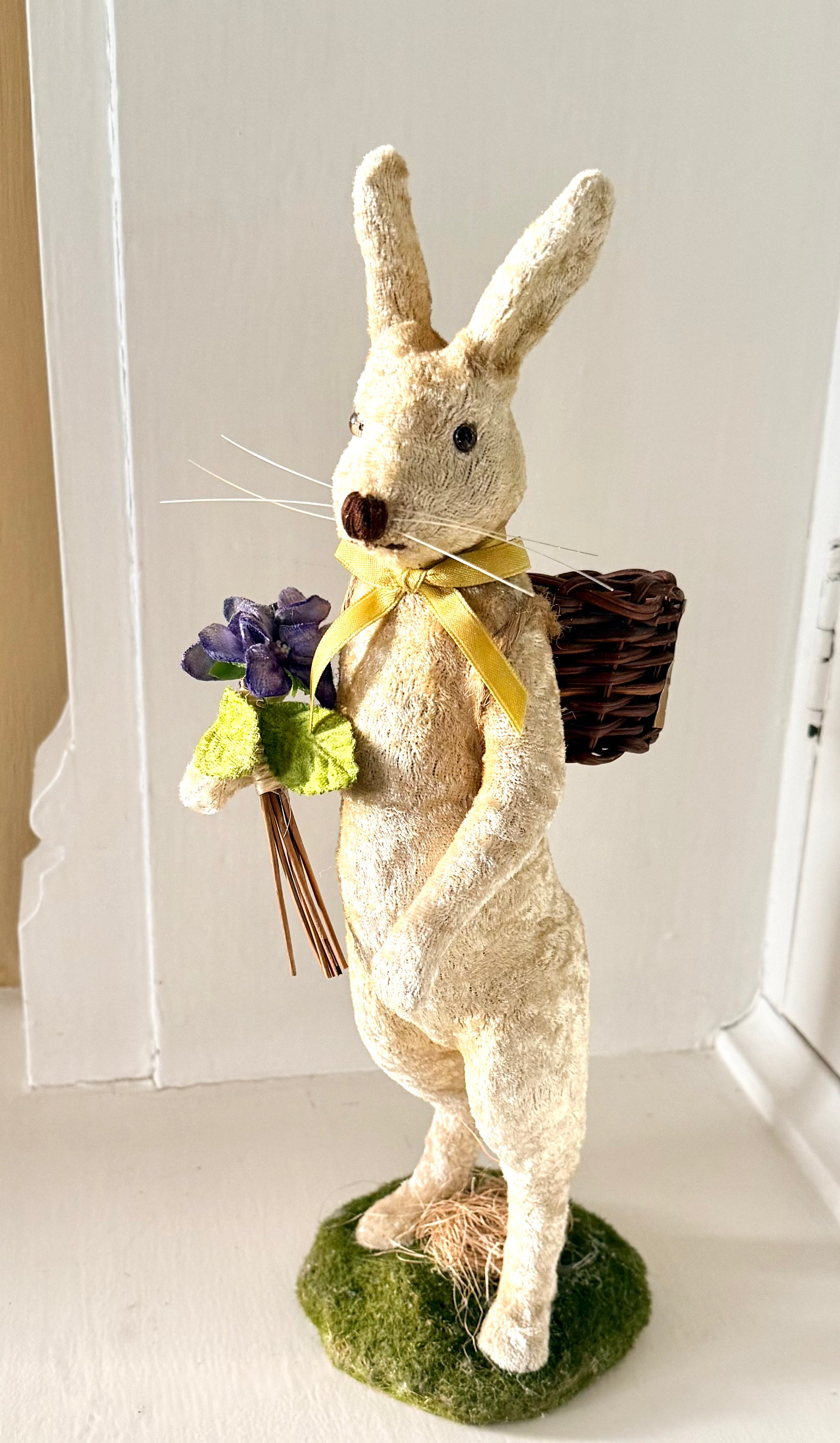 Cream colored velour fur with a chartruese satin bow, velvet violets and a wicker basket on it's back. Standing on faux grass with real straw.