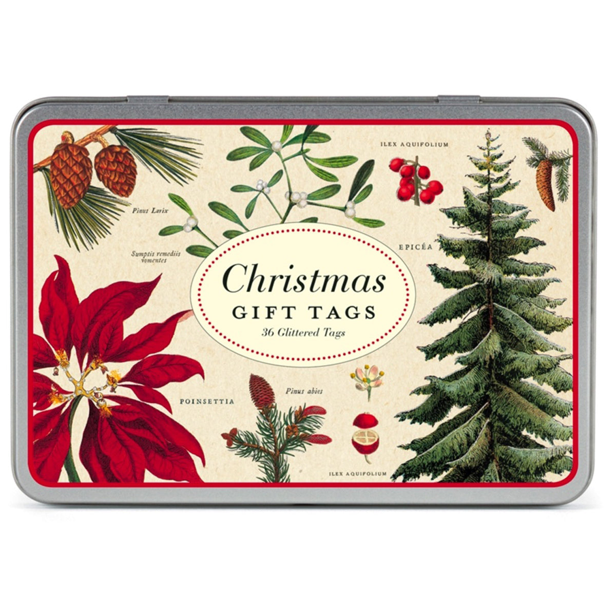 36 Glittered vintage Christmas gift tags in a reusable tin.