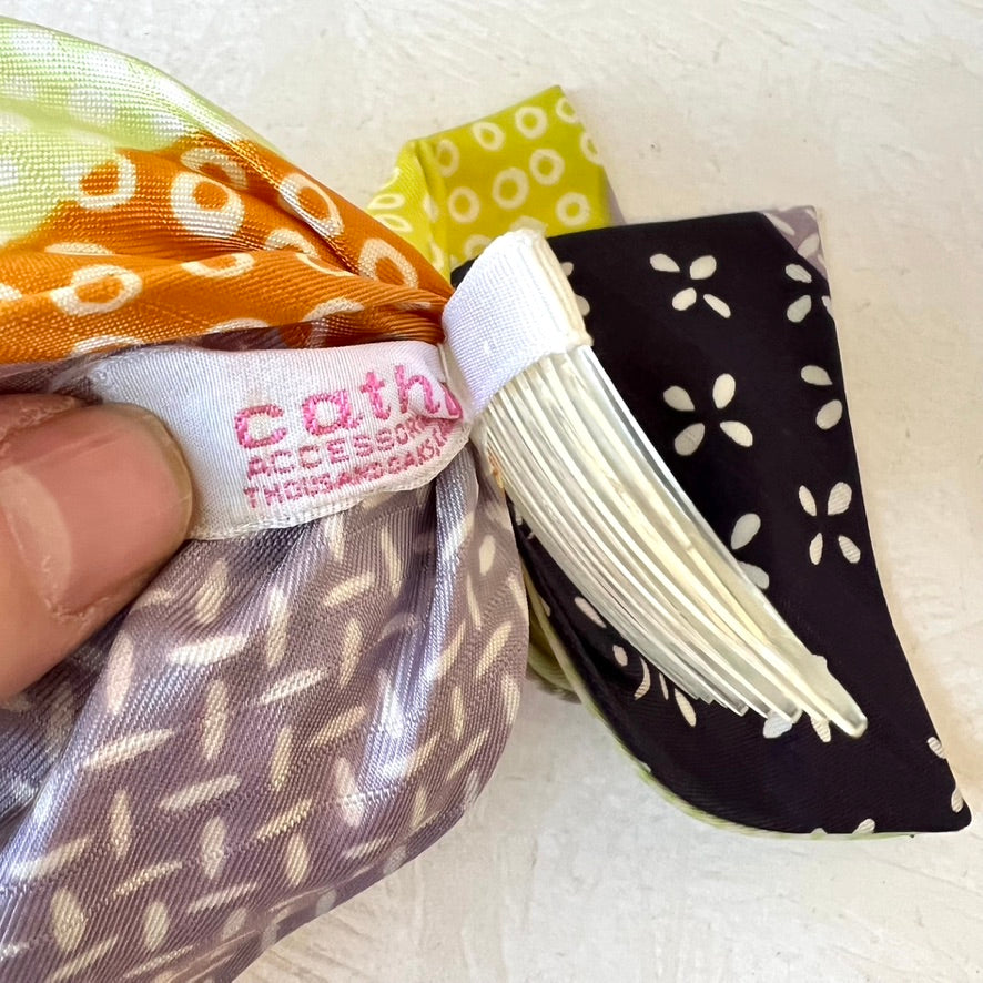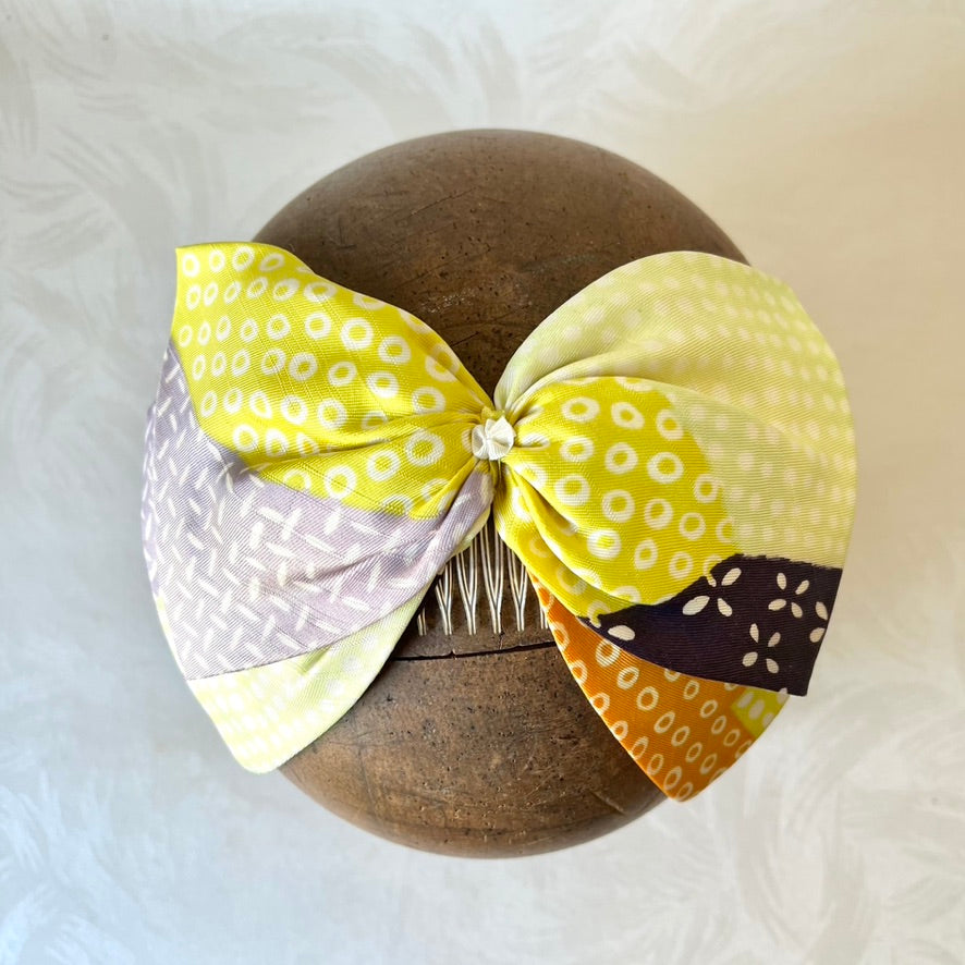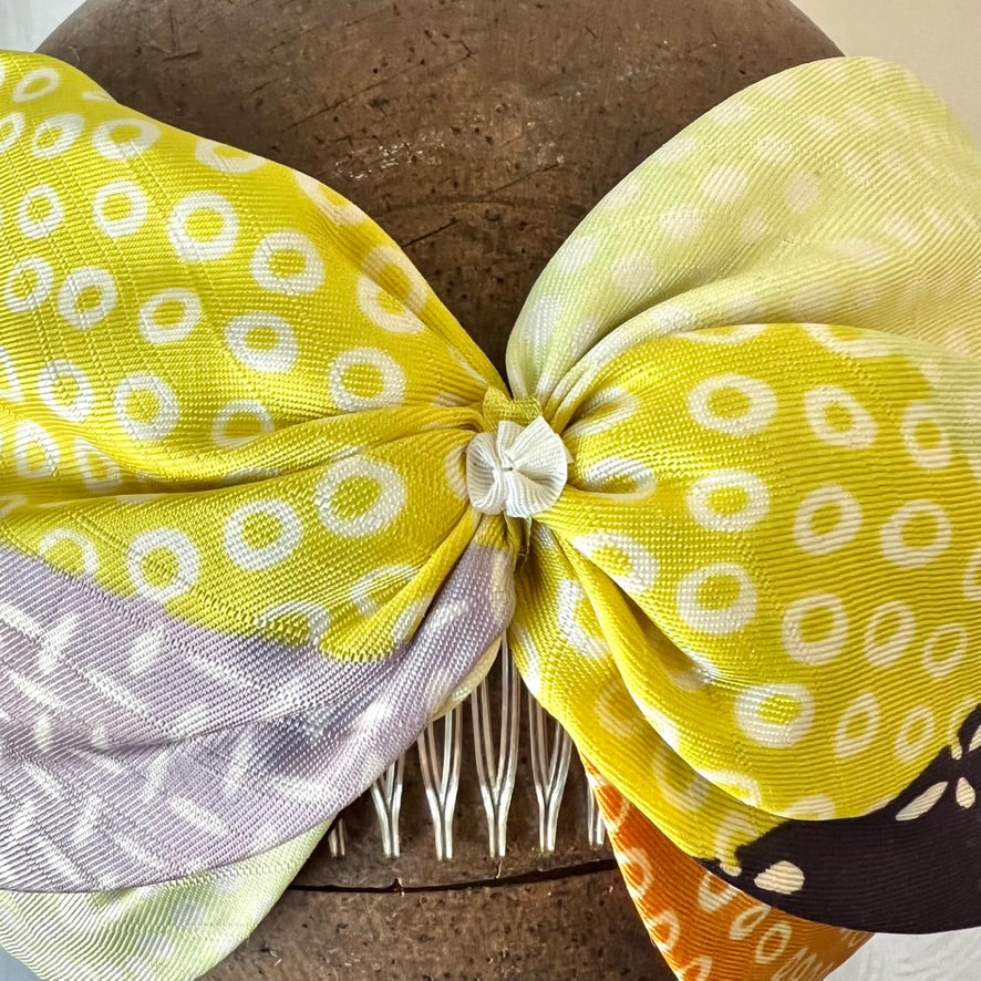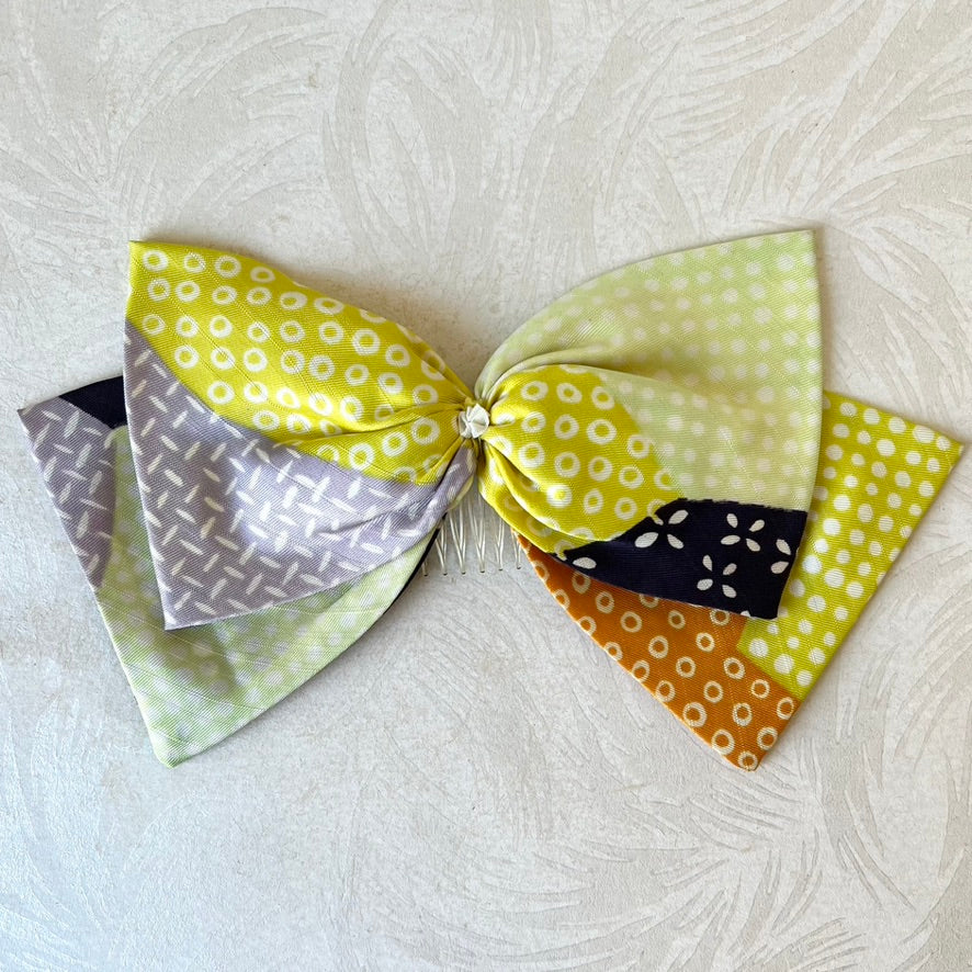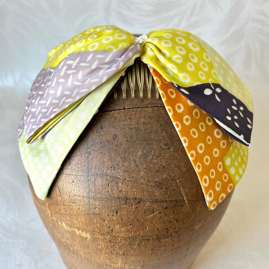 Retro taffeta bow on a comb. Graphic designed fabric in shades of lime, chartreuse, gray, black and orange. There is a tiny little flower in the center of the bow.