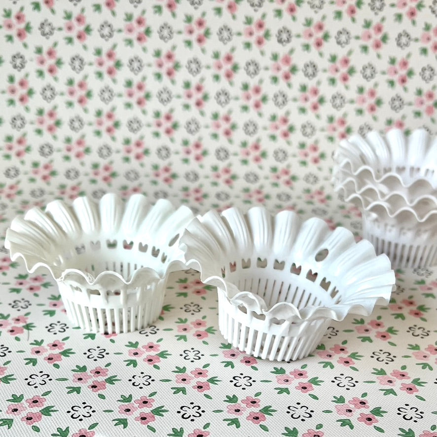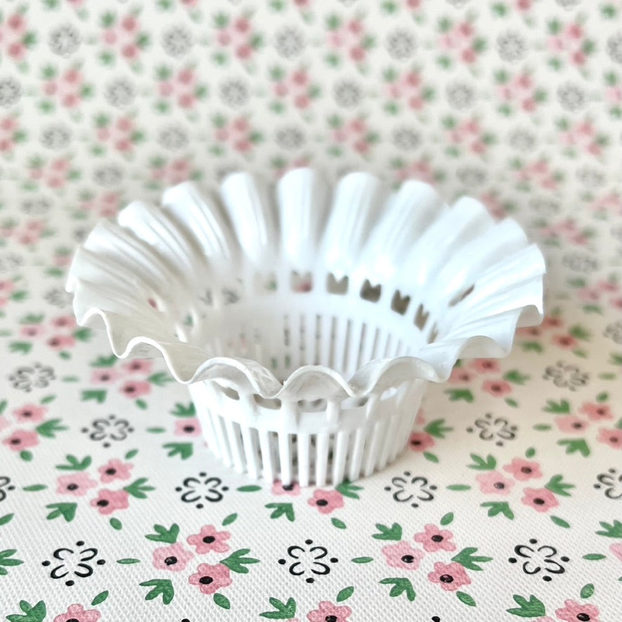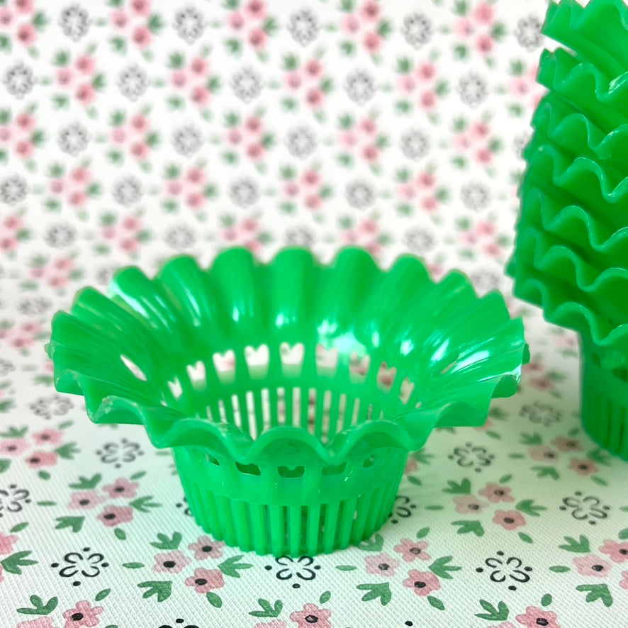 Adorable plastic vintage 1950's treat baskets with ruffled sides in 3 different colors. There are so many things you can do with these, including treats at a birthday party, Easter celebration, and May Day.