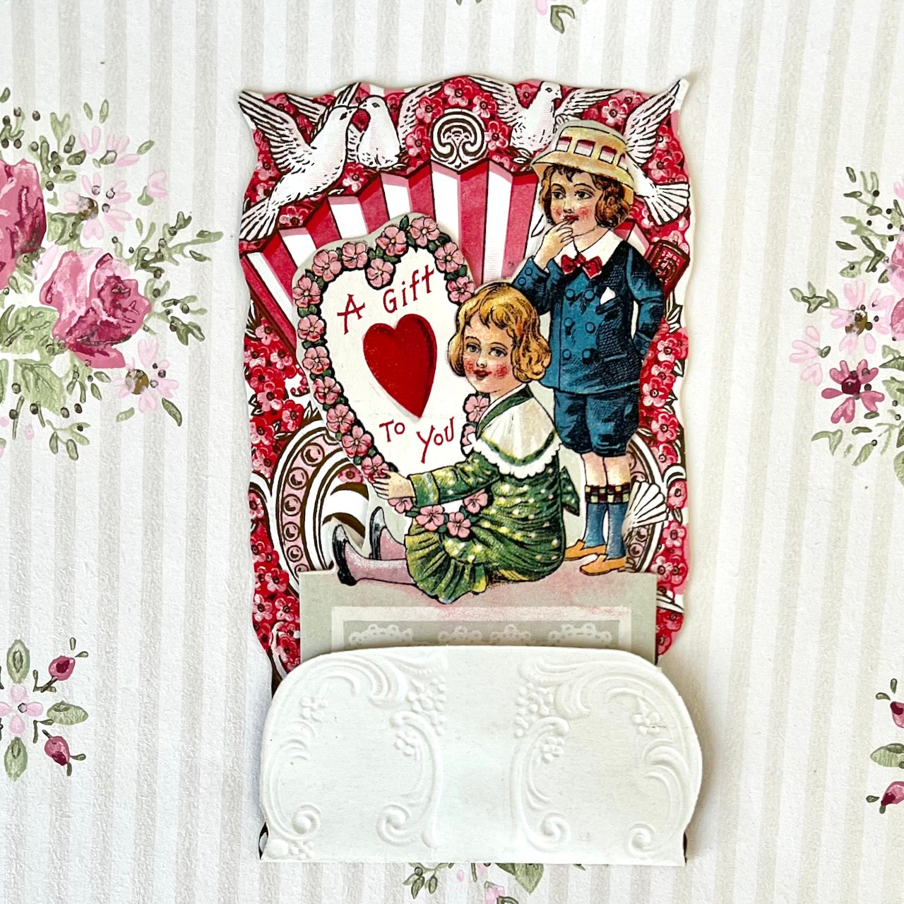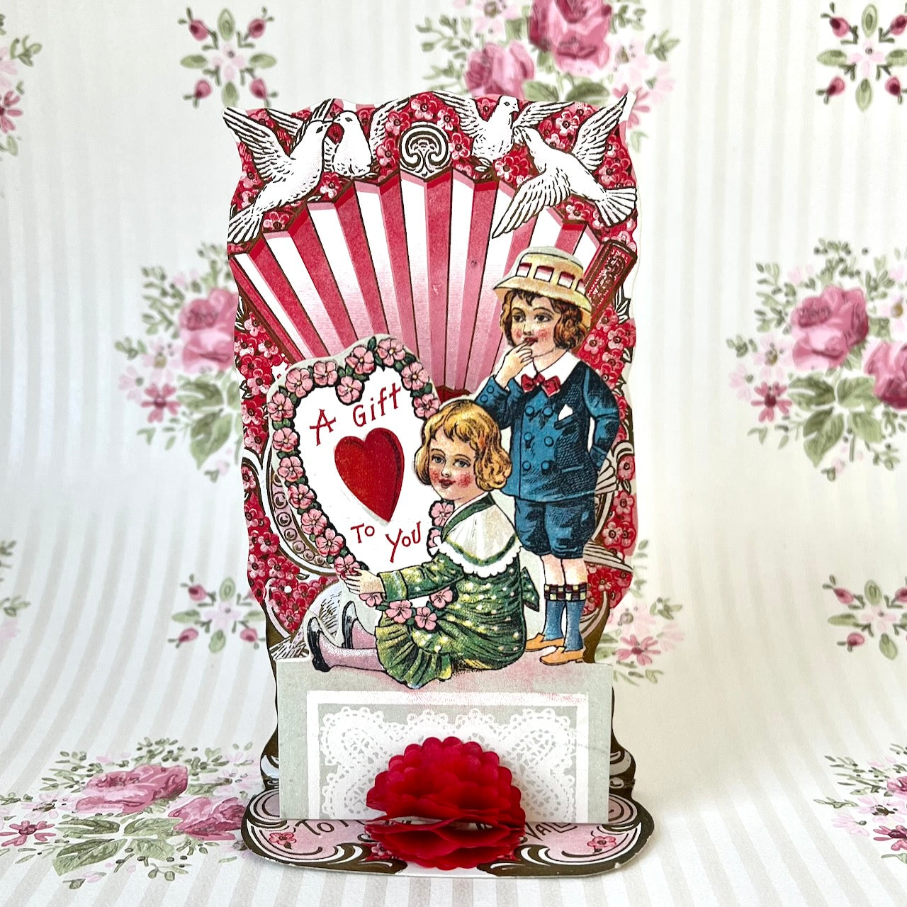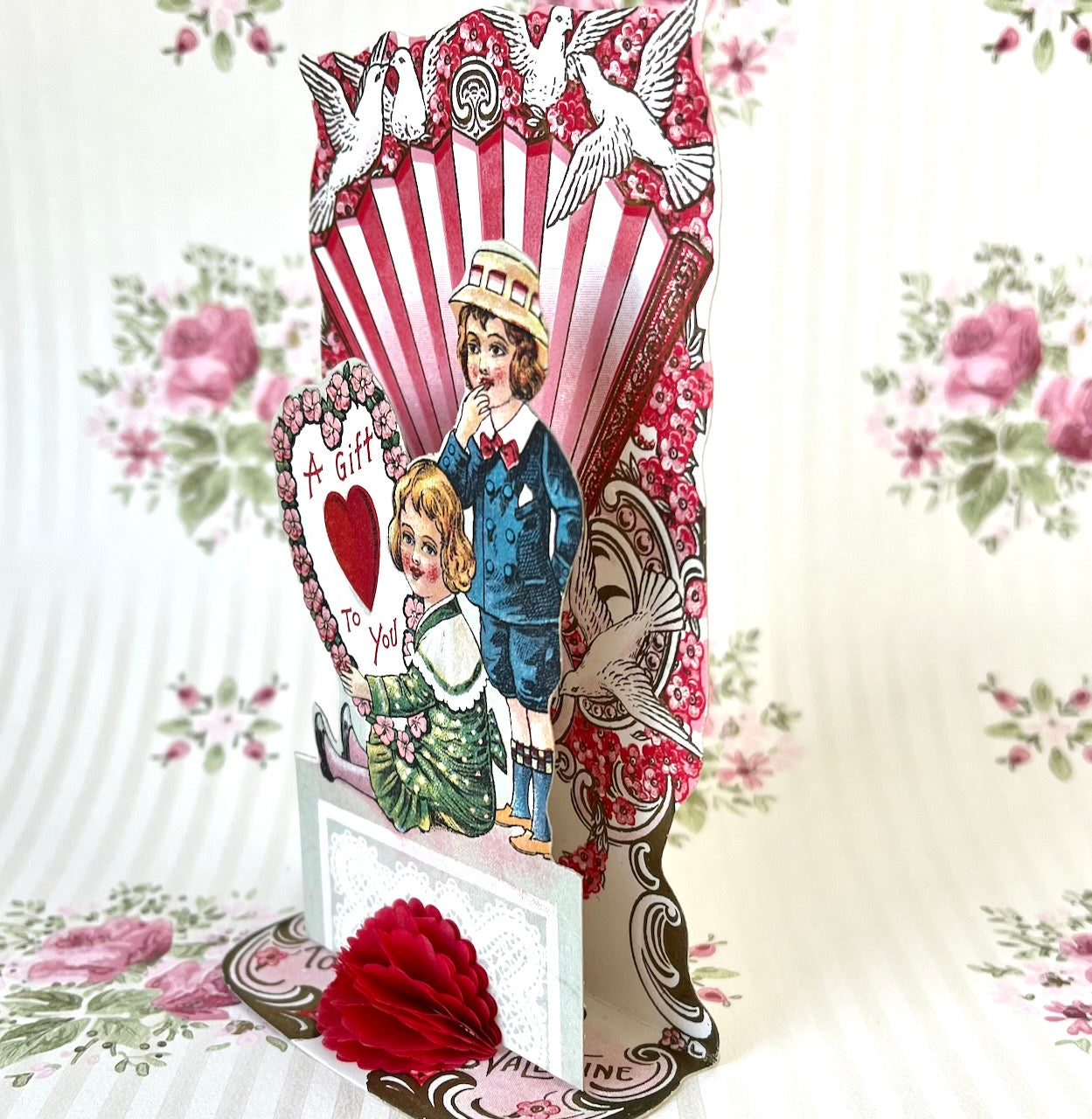Beautiful 3D Vintage Valentine Card. Pull down the front panel and a red honeycomb ball forms at the bottom