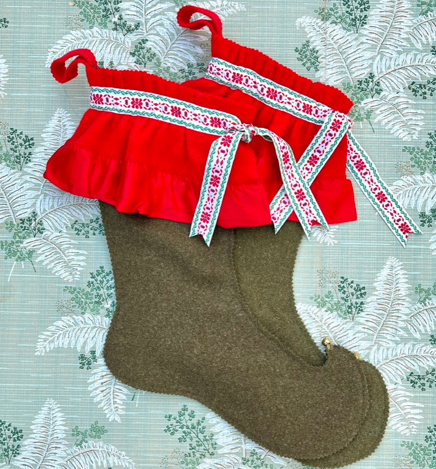 Quintessential Christmas combinations olive green stocking with ruffled red cuff, wonderful vintage jacquard trimming.