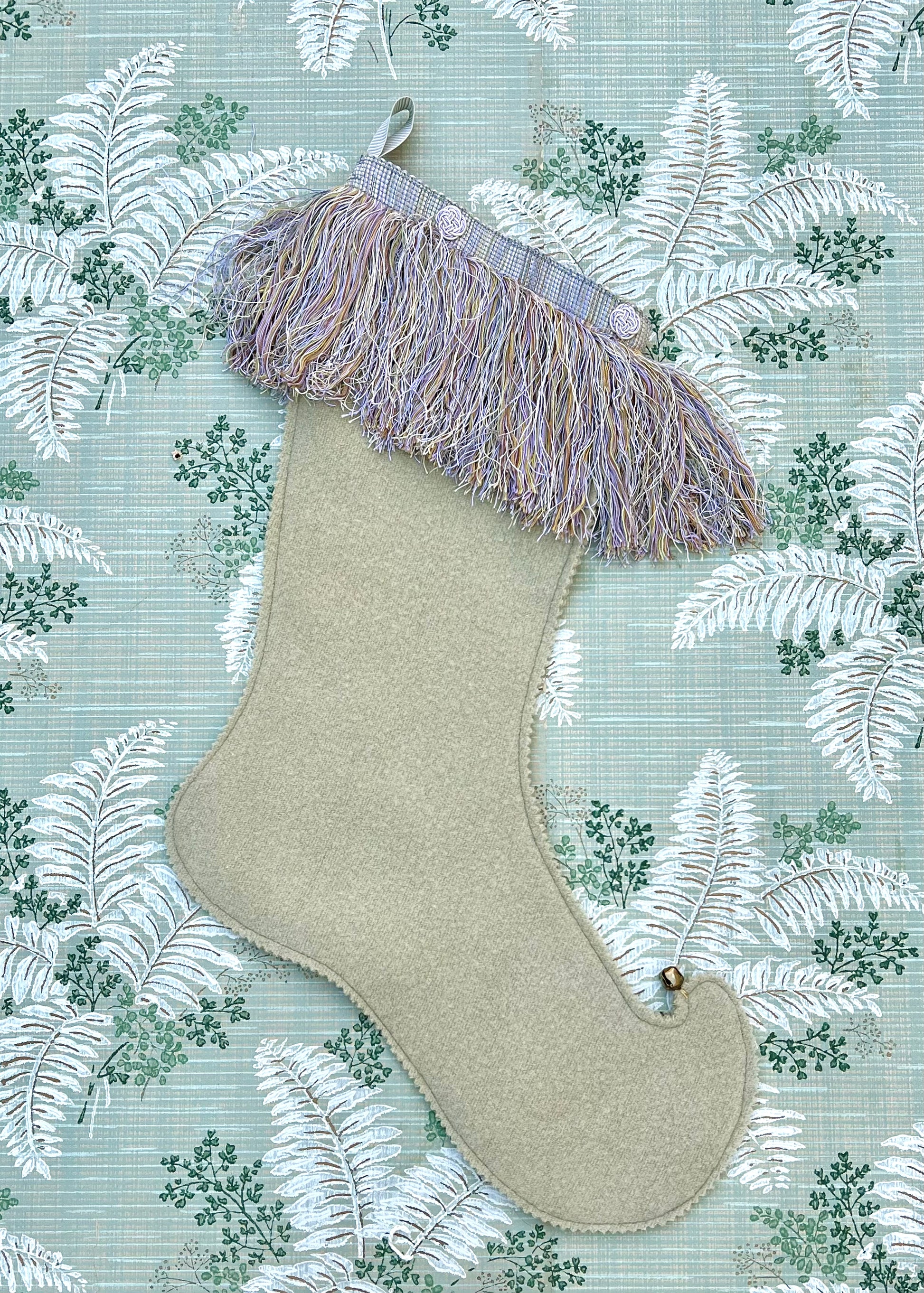 Long and lovely 6" chainette fringe as cuff on a scrumptious light green stocking. Perfect for any fireplace, or shelf, or bedpost.....