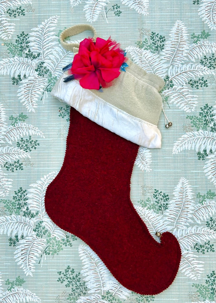 Luxurious burgundy wool stocking, with a pale green cuff, topped with a dramatic silk and sheer millinery flower and lacquered holly leaves.