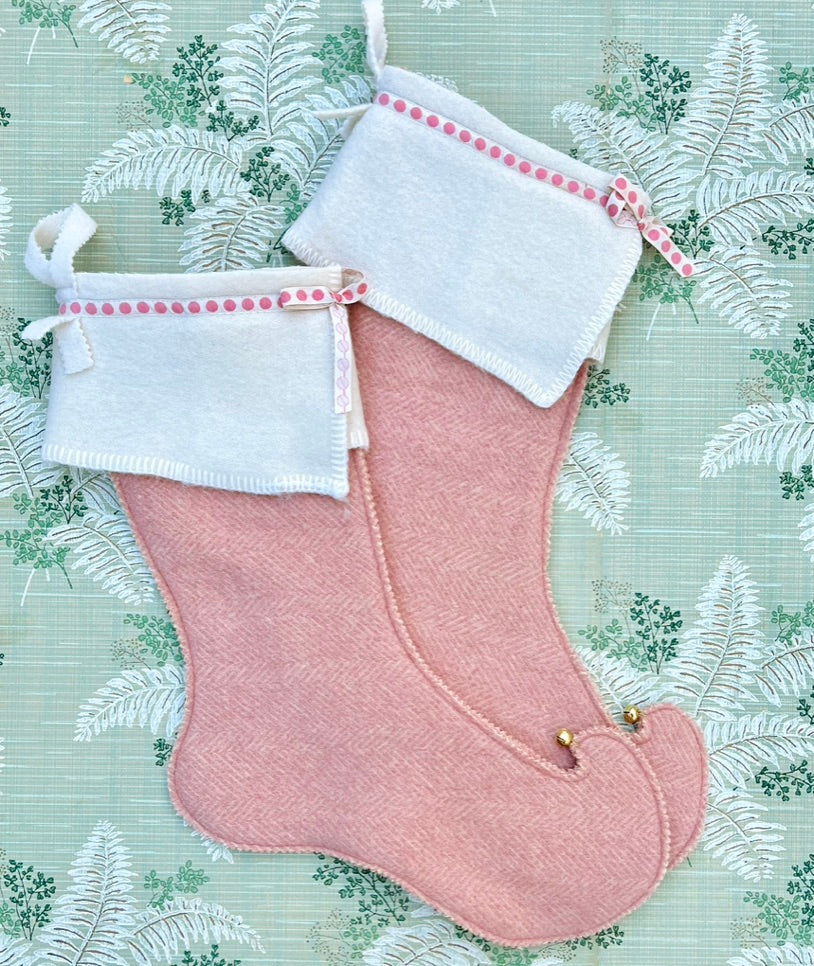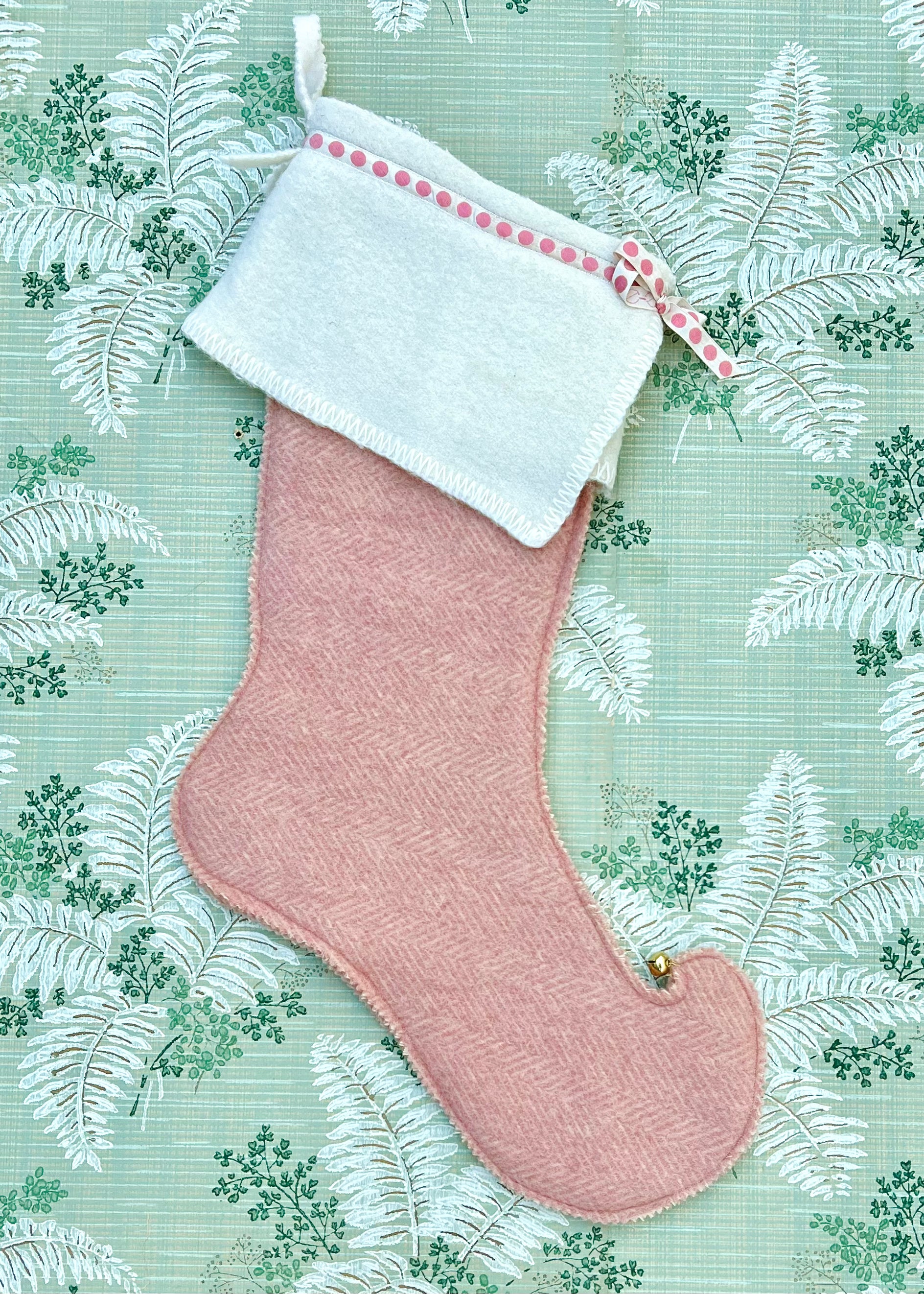 This style of stocking reminds us of skiing in the alps. Cozy pink stocking with a sophisticated off white cuff. The cotton jacquard ribbon makes it playful. Tres Chic