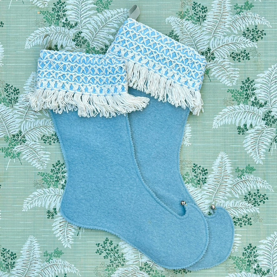 Wonderful felted wool from vintage blankets handmade into Christmas stockings. Each stocking is one (or a pair), of a kind, using vintage woven wool, vintage ribbons and or millinery flowers and finished with a vintage bell at the toe.